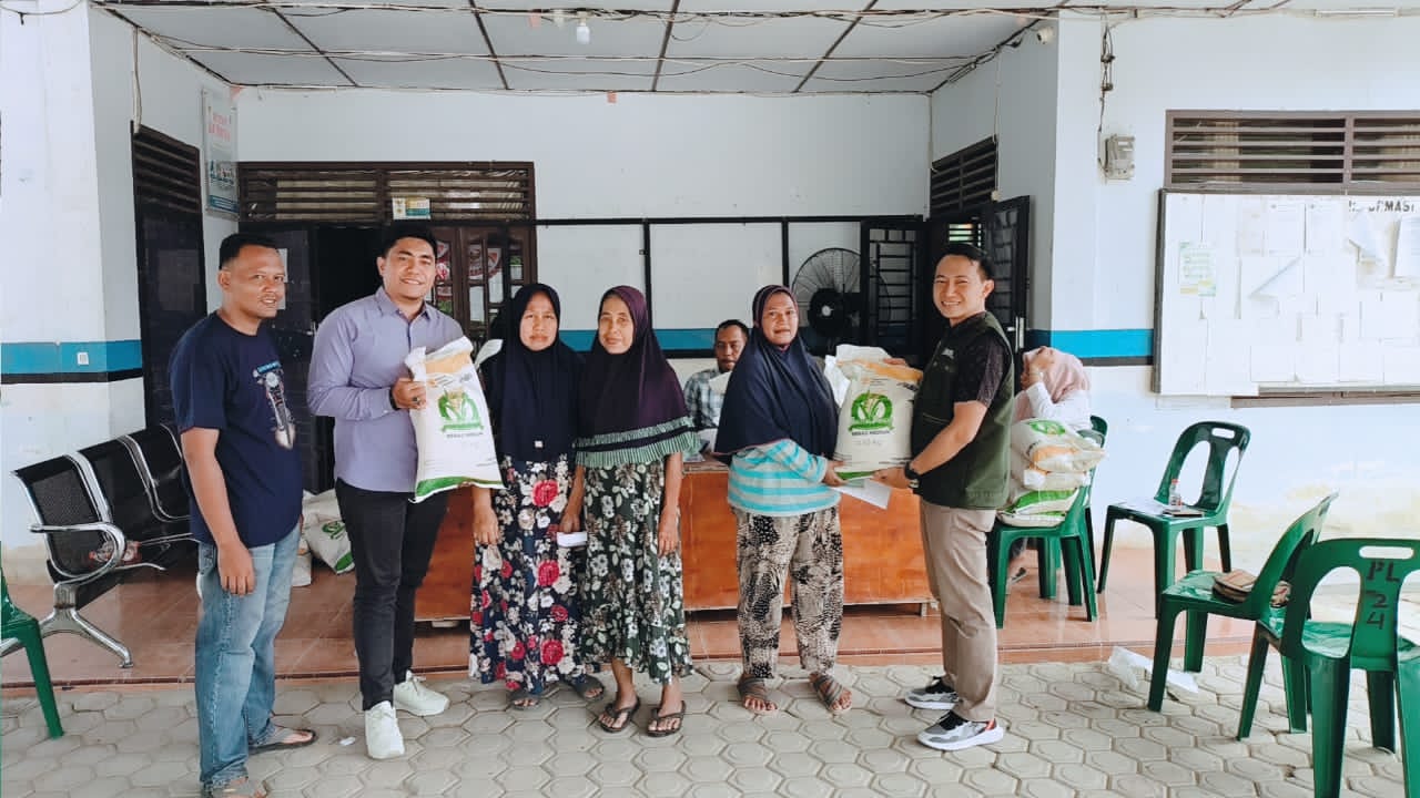 Pemimpin Cabang Bulog Labuhanbatu, Lutfillah Barus (kiri) saat menyerahkan bantuan pangan ke penerimanya.