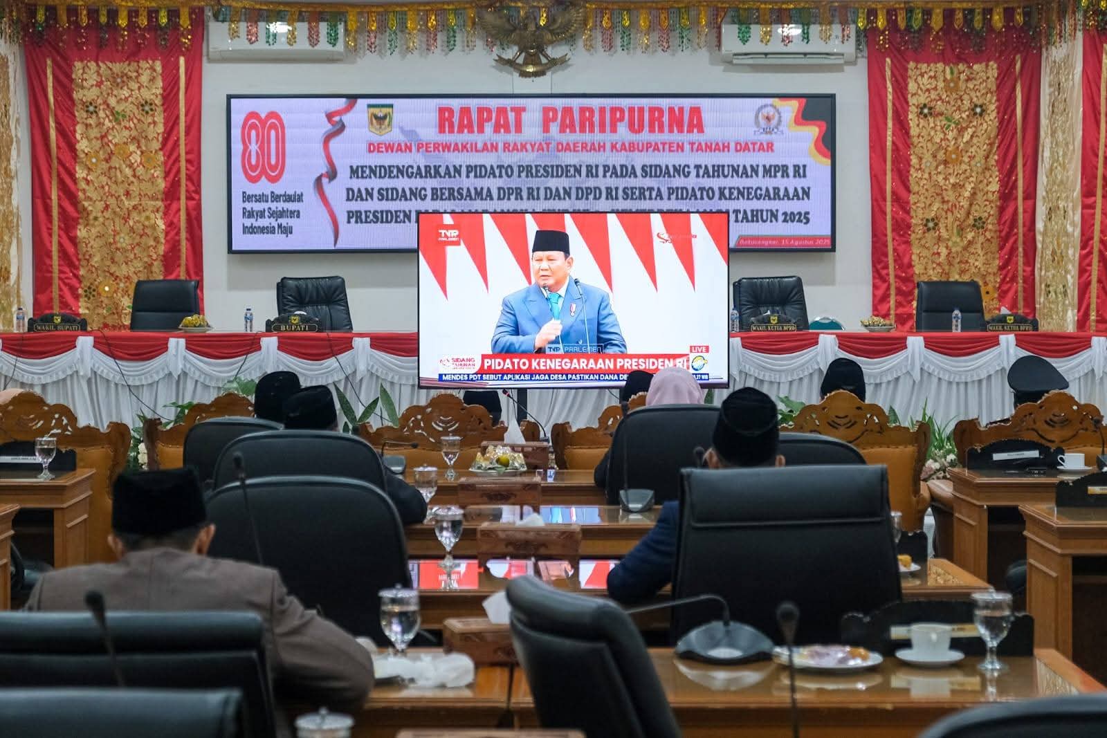 Tanah Datar, fajarharapan.id – Sudah menjadi kegiatan rutin setiap tahunnya Dewan Perwakilan Rakyat Daerah (DPRD) Kabupaten Tanah Datar menggelar Rapat Paripurna dengan Acara Mendengarkan Pidato Kenegaraan Presiden RI pada Sidang Tahunan MPR RI dan Sidang Bersama DPR RI serta Peringatan HUT Ke 80 Kemerdekaan Republik Indonesia.