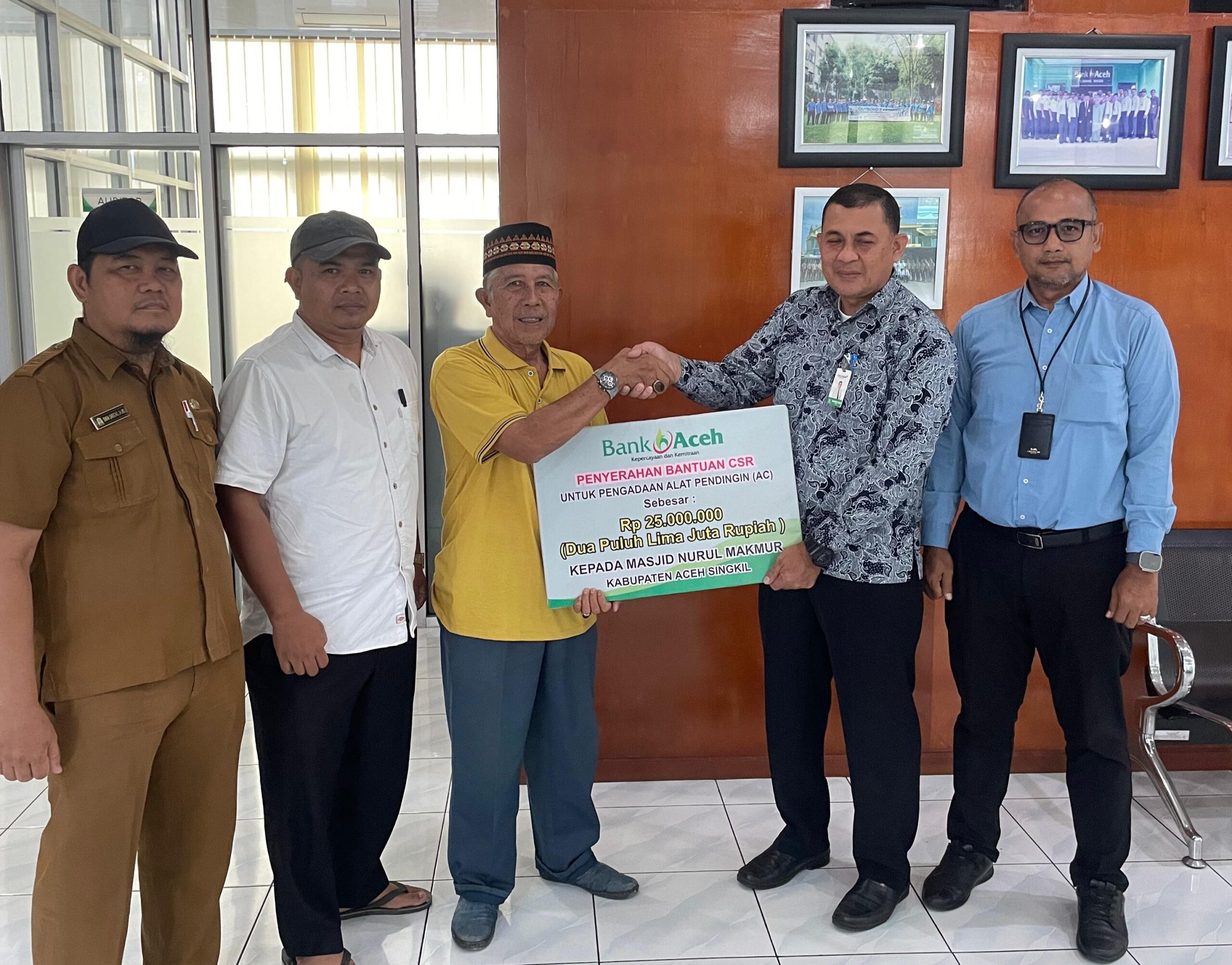 Singkil, fajarharapan – Bank Aceh Syariah Cabang Aceh Singkil menyerahkan bantuan dana Corporate Social Responsibility (CSR) sebesar Rp 25 juta kepada Badan Kemakmuran Masjid (BKM) Agung Nurul Makmur, Kabupaten Aceh Singkil. Dana ini dialokasikan untuk pembelian alat penyejuk ruangan atau Air Conditioner (AC) guna meningkatkan kenyamanan para jemaah.