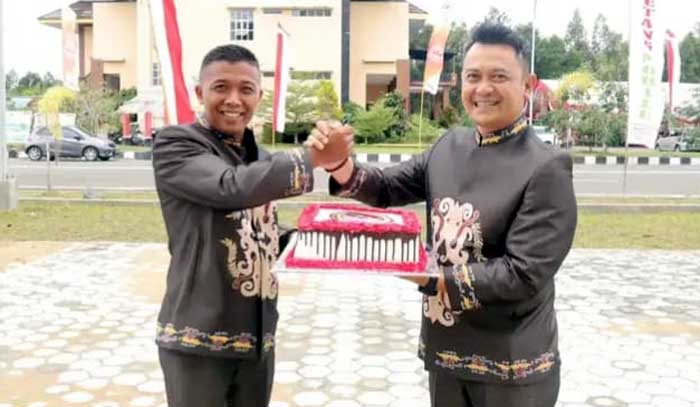 Dandim menyerahkan kue ulang tahun dan sekaligus memberi ucapan selamat Hari Bhayangkara yang ke-77. Acara tersebut berlangsung setelah Dandim 1011/Klk menghadiri upacara dan acara ramah tamah dalam peringatan hari jadi Kabupaten Pulang Pisau yang ke-21, Senin (03/07/2023).