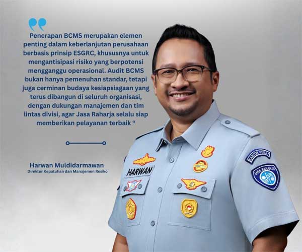 Harwan Muldidarmawan, Direktur Kepatuhan dan Manajemen Risiko Jasa Raharja menjelaskan, penerapan BCMS yang efektif menjadi bagian penting dalam keberlanjutan Perusahaan yang berlandaskan prinsip Environmental, Social, Governance, Risk Management, and Compliance (ESGRC) khususnya dalam mengantisipasi potensi risiko yang dapat mengganggu operasional.