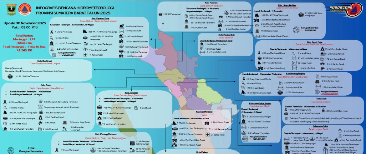 Padang — Pemerintah Provinsi Sumatera Barat (Pemprov Sumbar) melalui Pusdalops BPBD kembali merilis pembaruan data korban bencana hidrometeorologi yang melanda sejumlah daerah sejak 21 November 2025. Hingga Minggu (30/11) pukul 09.00 WIB, tercatat 129 orang meninggal dunia dan 86 orang masih dinyatakan hilang.