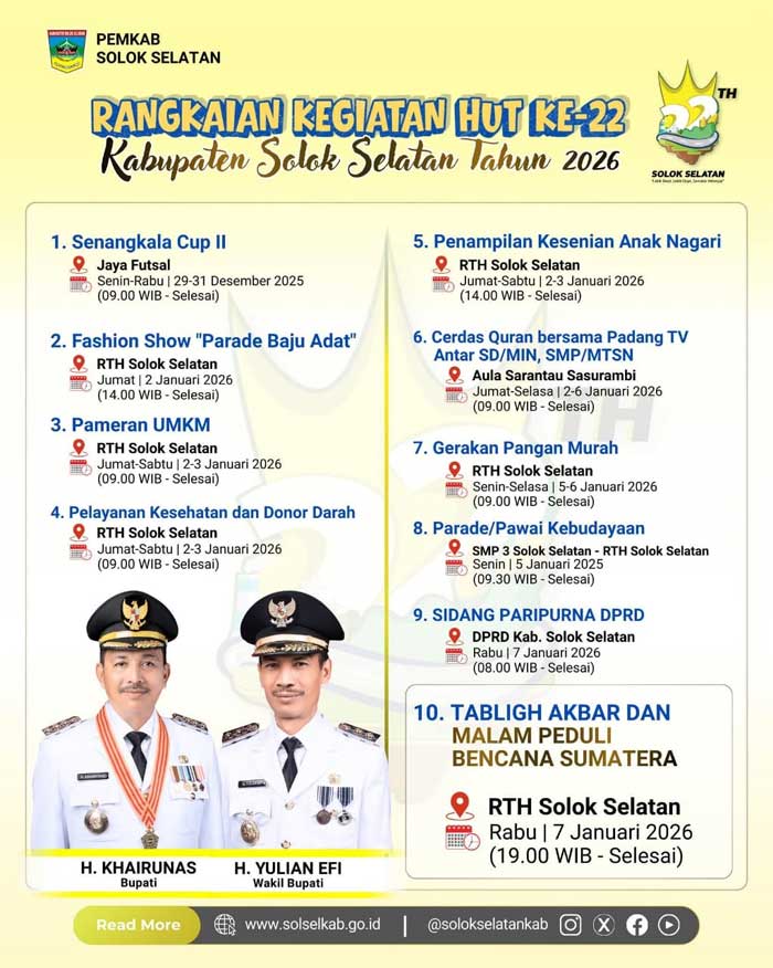 Menyambut hari jadi yang ke-22, Pemerintah Kabupaten (Pemkab) Solok Selatan resmi merilis rangkaian kegiatan besar-besaran yang akan memanjakan masyarakat setempat.