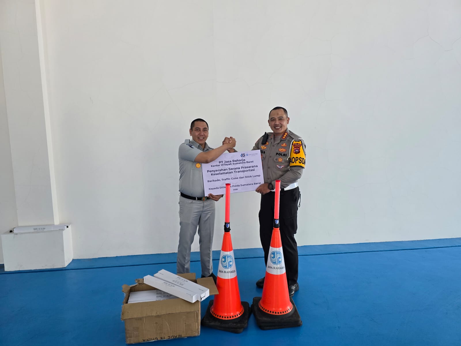Penyerahan bantuan tersebut dilaksanakan melalui penandatanganan serah terima sarana prasarana keselamatan transportasi yang dilakukan langsung oleh Kepala Kantor Wilayah Jasa Raharja Sumatera Barat, Teguh Afrianto, bersama Direktur Lalu Lintas Polda Sumatera Barat, Kombes Pol. Reza.