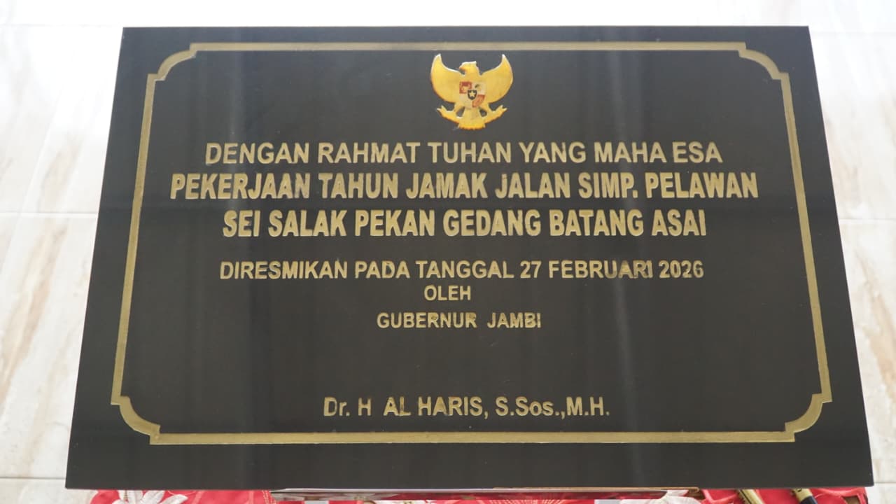 Batang Asai, Jambi, fajarharapan.id – Gubernur Jambi, Al Haris menandatangani prasasti peresmian Jalan Simpang Pelawan–Batang Asai sepanjang lebih kurang 88 kilometer. Penandatanganan dilaksanakan di Masjid Jami’ Al Muhajirin, Pasar Gerabak, Desa Pekan Gedang, Kecamatan Batang Asai, Kabupaten Sarolangun, Jumat (27/02/2026).
