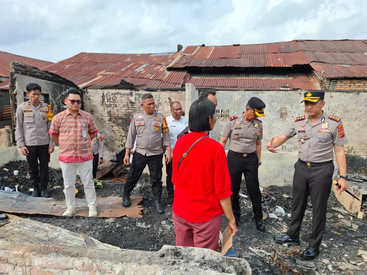 Petugas kepolisian bersama warga langsung melakukan penanganan di lokasi, termasuk membantu pembersihan puing-puing sisa kebakaran.