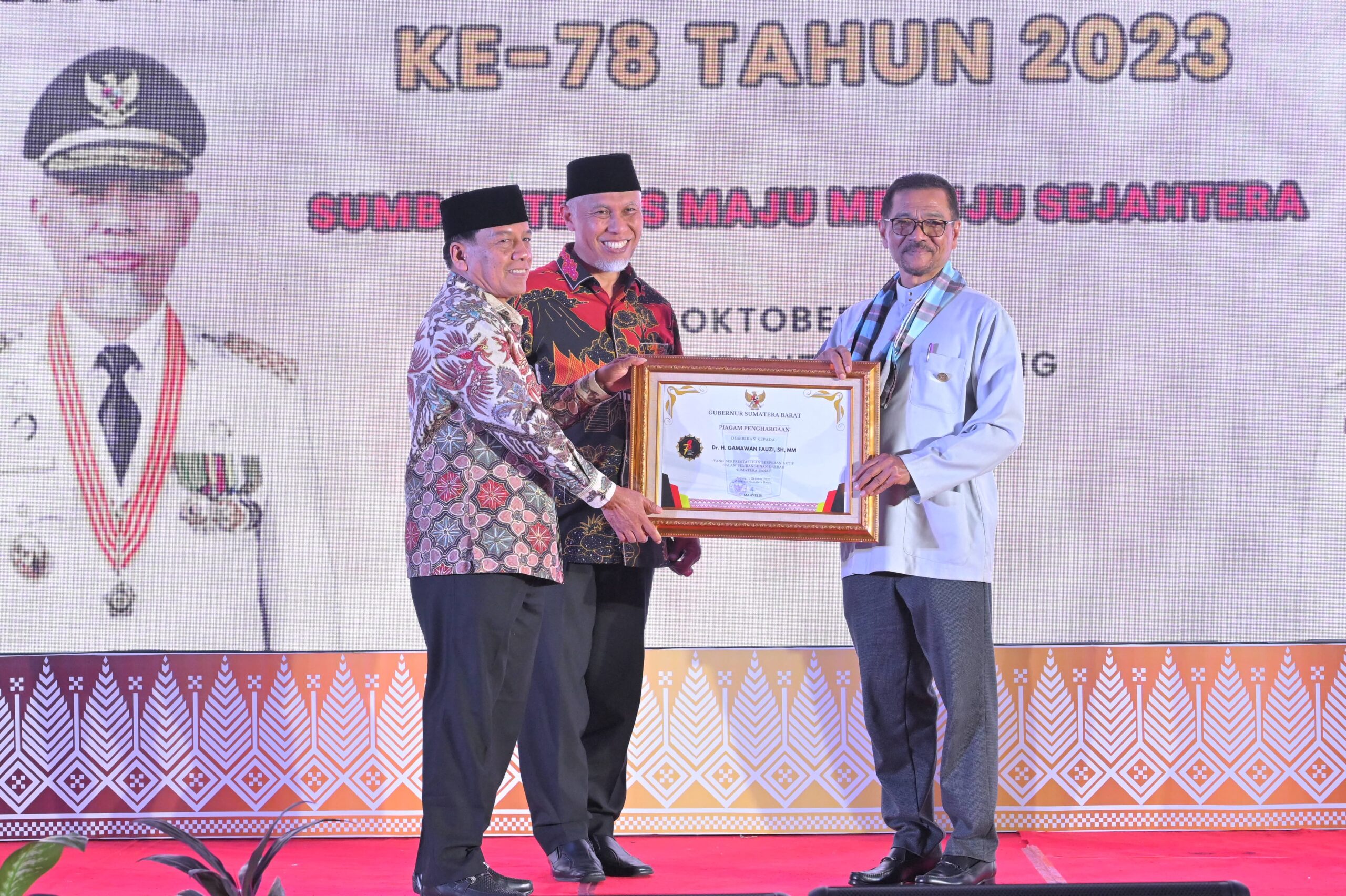 Padang – Pemerintah Provinsi Sumatera Barat (Pemprov Sumbar) memberikan penghargaan kepada belasan organisasi dan tokoh masyarakat yang dinilai berjasa terhadap pembangunan daerah, kegiatan tersebut dilangsungkan bersamaan dengan acara Malam Resepsi Hari Jadi Sumbar ke-78 di Hotel Truntum Padang, Minggu malam (1/10/2023). Anugerah yang diberi nama “Penghargaan Tuah Sakato” tersebut, diserahkan langsung oleh Gubernur Sumatera Barat, Mahyeldi Ansharullah bersama Pimpinan DPRD Sumbar, Suirpen Syuib.