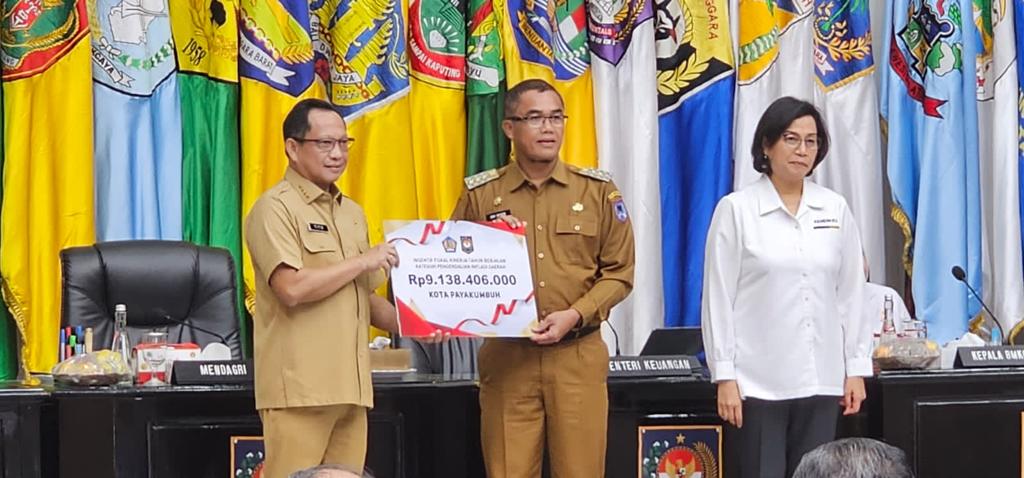 Penghargaan itu langsung diberikan oleh Mendagri Muhammad Tito Karnavian dan Menkeu Sri Mulyani kepada Pj. Wali Kota Payakumbuh Rida Ananda di Sasana Bhakti Praja, Kantor Pusat Kementerian Dalam Negeri, Jakarta Pusat, Senin (31/072023).