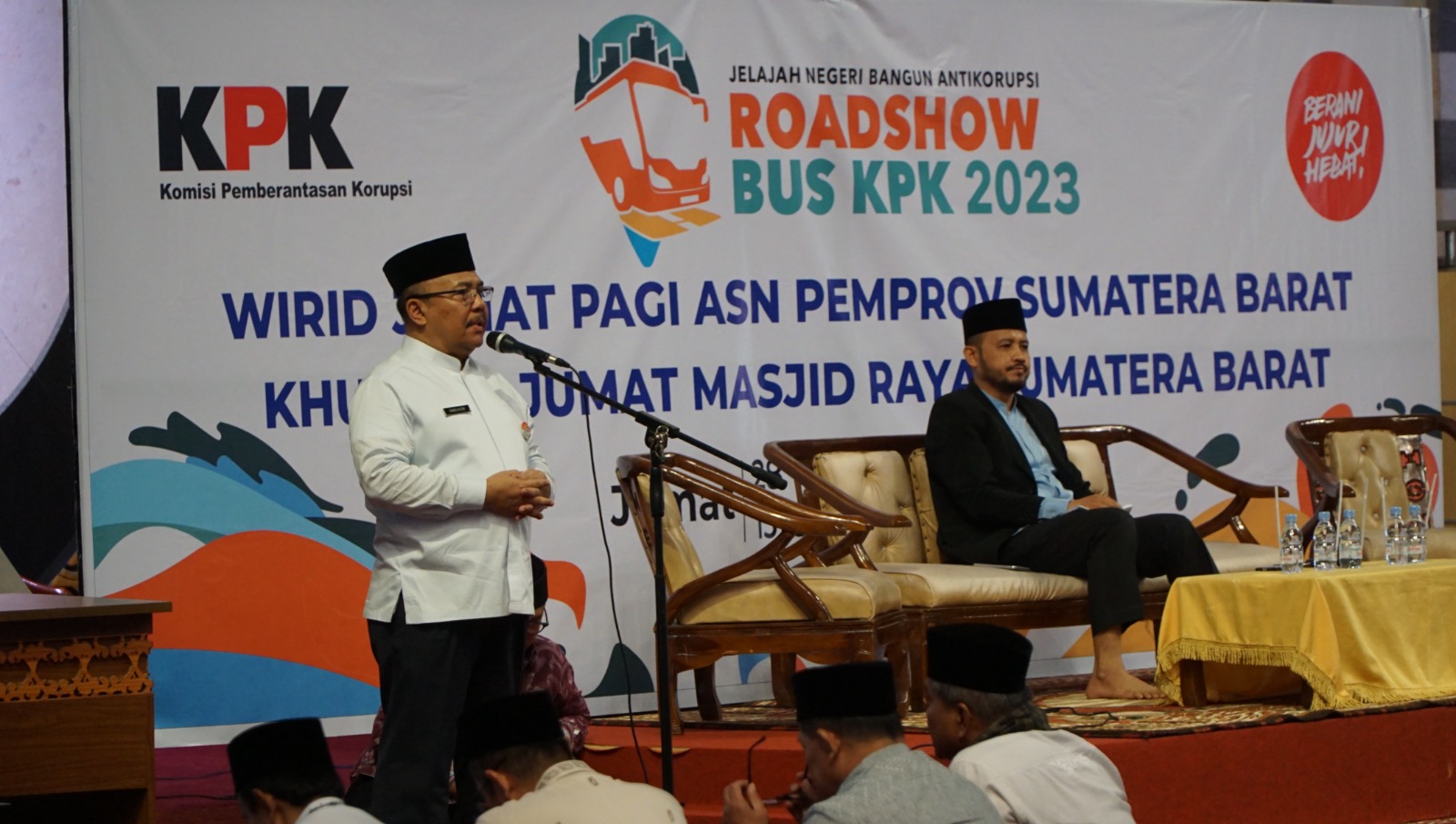 Bahkan dalam kegiatan itu, Pemprov Sumbar juga melibatkan langsung pihak Komisi Pemberantasan Korupsi (KPK) RI. Uniknya, sosialisasi tersebut dikemas tidak hanya dalam forum resmi pemerintahan. Tapi juga, dalam kegiatan wirid bulanan ASN Pemprov Sumbar di Masjid Raya Sumbar, Jum’at (13/10/2023).