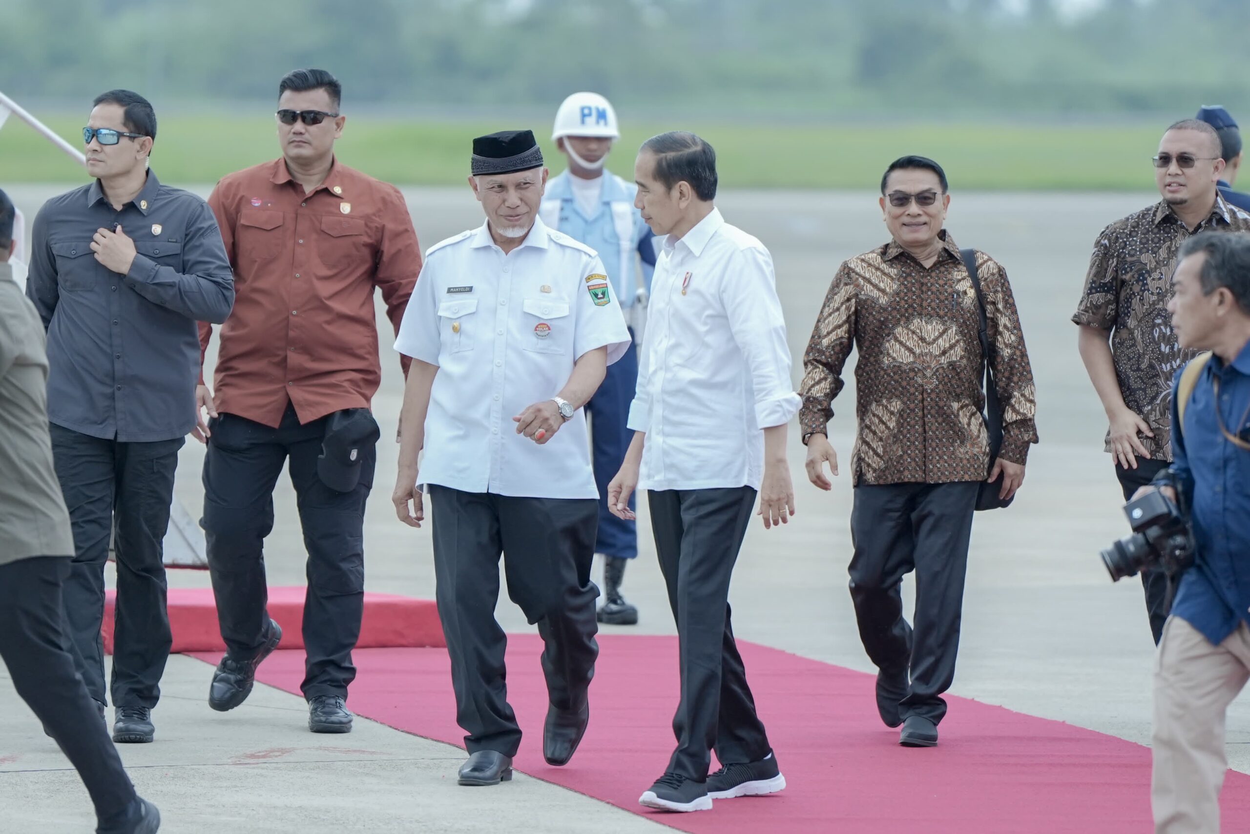 Sebelumnya, Presiden Joko Widodo mendarat di Bandara Internasional Minangkabau (BIM) pada Rabu siang menggunakan Pesawat Kepresidenan untuk menjalani serangkaian agenda kerja di Kabupaten Kepulauan Mentawai dan Kota Padang. Kedatangan Presiden disambut oleh Gubernur Sumbar, Mahyeldi Ansharullah; Wakil Gubernur Sumbar, Audy Joinaldy; Pangdam I/Bukit Barisan, Mayjen Mochammad Hasan Hasibuan; Kapolda Sumbar, Irjen Pol Suharyono; Danrem 032/Wbr, Brigjen TNI Rayen Obersyl; dan Ketua DPRD Sumbar, Supardi. (Adpsb/Isq)
