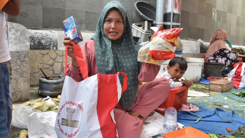 Sembako yang kami terima ini, sebut Melani, berupa beras, gula, teh, roti, dan minyak goreng yang dimasukkan ke dalam kantong bertuliskan Bantuan Presiden Republik Indonesia.