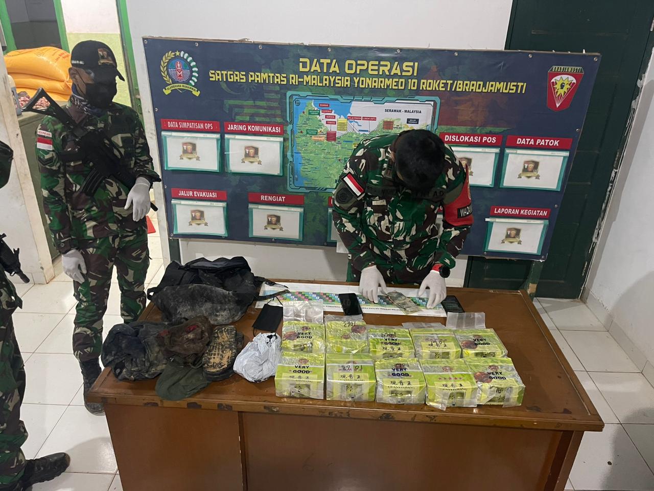 “Setelah selama kurang lebih dua hari melaksanakan Patroli, pada hari ini,tadi sekitar pukul 04.15 WIB, Tim Patroli berhasil mengamankan pelaku yang membawa ransel,yang saat diperiksa berisi 10 paket kristal putih dalam kemasan Teh Guanyinwang diduga sabu seberat kurang lebih 10 Kilogram,” ungkap Danrem.