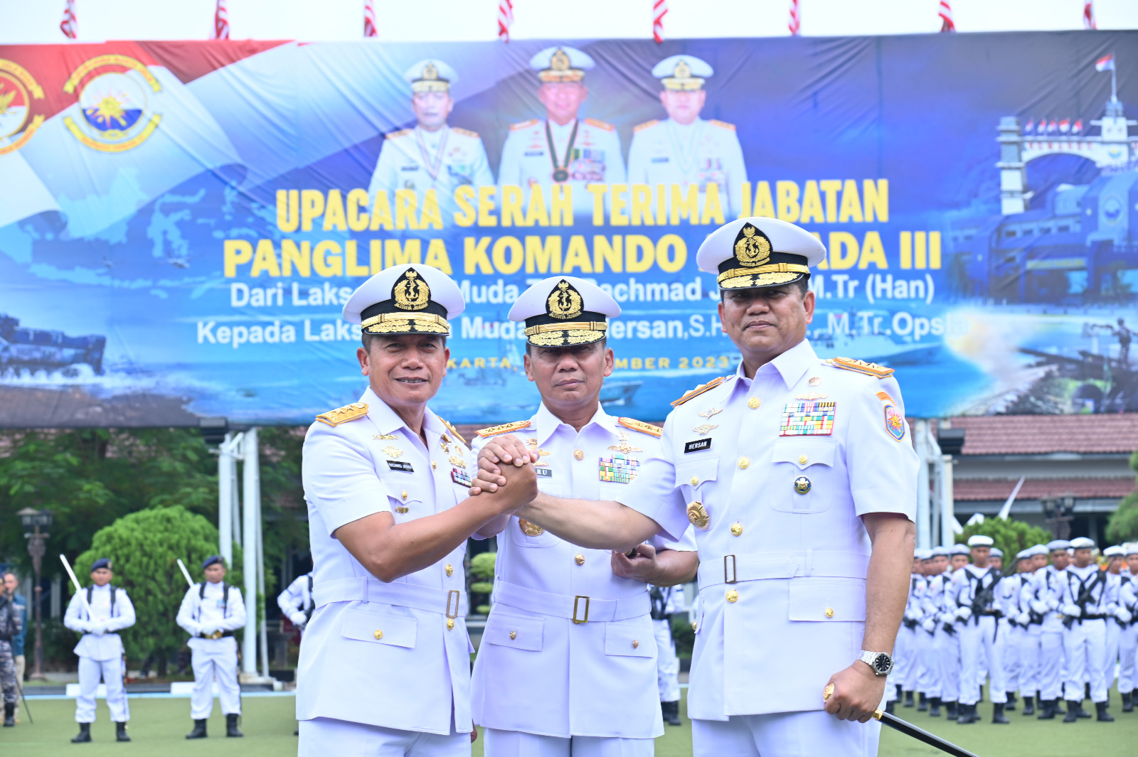 Jakarta, fajarharapan.id – Bertempat di Lapangan Arafuru, Mako Koarmada RI, Jakarta Pusat, Panglima Koarmada Republik Indonesia (Pangkoarmada RI) Laksamana Madya TNI Heru Kusmanto, memimpin upacara serah terima jabatan Jabatan Panglima Komando Armada III (Pangkoarmada III) yang diserah terimakan dari Laksamana Muda TNI Rachmad Jayadi kepada Laksamana Muda TNI Hersan. Senin (27/11/2023).
