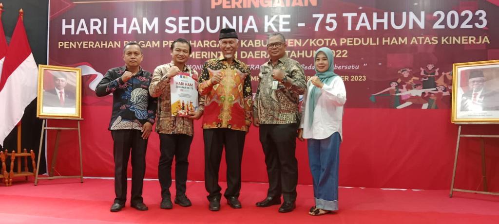 Penghargaan ini diterima oleh Bupati Solok Selatan yang diwakili Sekdakab Dr. H. Syamsurizaldi pada peringatan ke-75 Hari HAM Internasional di Kantor Wilayah Kemenkumham Sumatera Barat, Senin (18/12/2023).