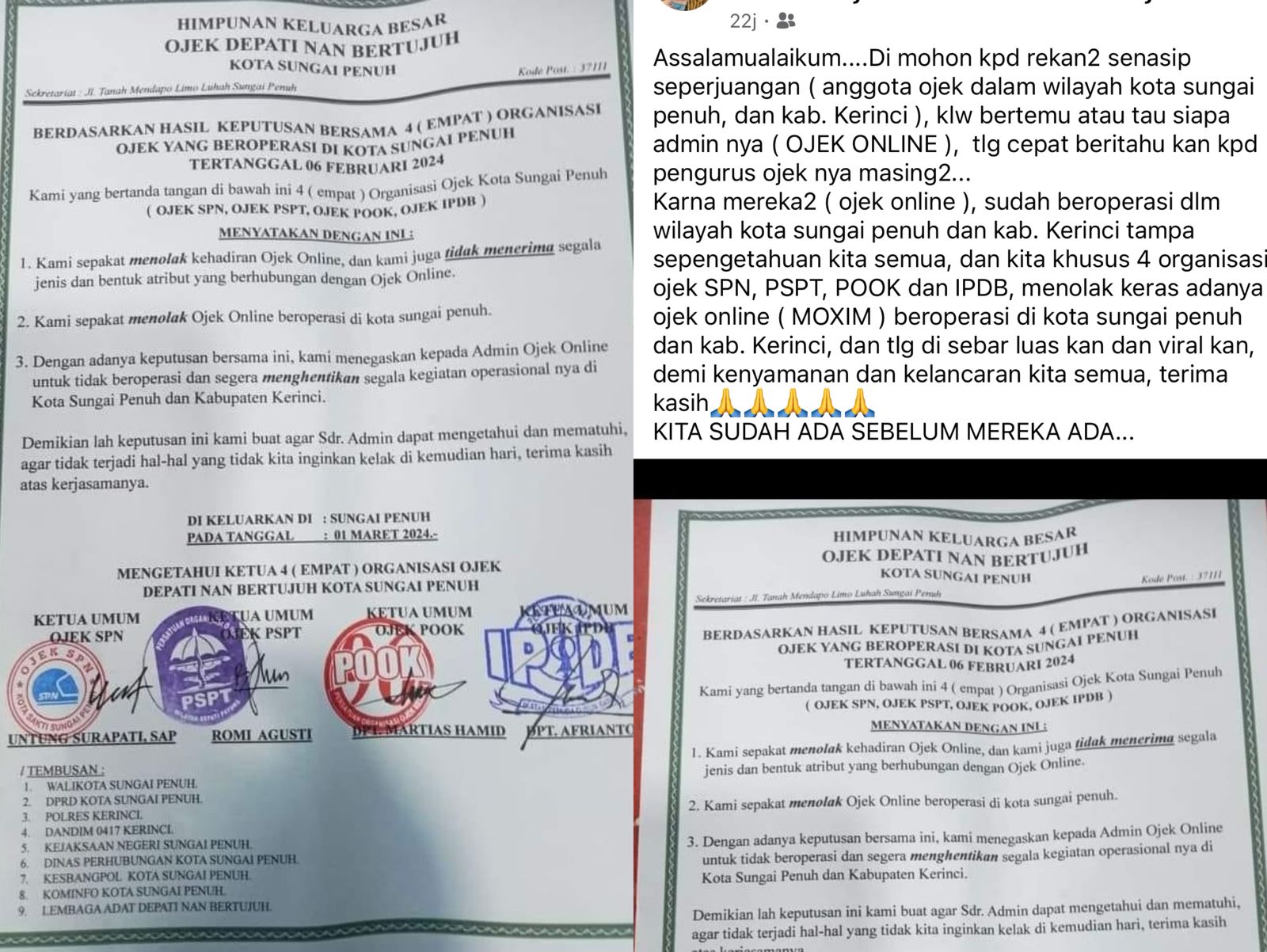 Sungai Penuh, FajarHarapan.id – Keputusan bersama dari empat organisasi ojek di Kota Sungai Penuh, yakni SPN, PSPT, IPDB, dan POOK, menegaskan penolakan terhadap kehadiran layanan ojek online seperti Maxim di kota yang memiliki semboyan Sahalun Suhak Salatuh Bdei ini.