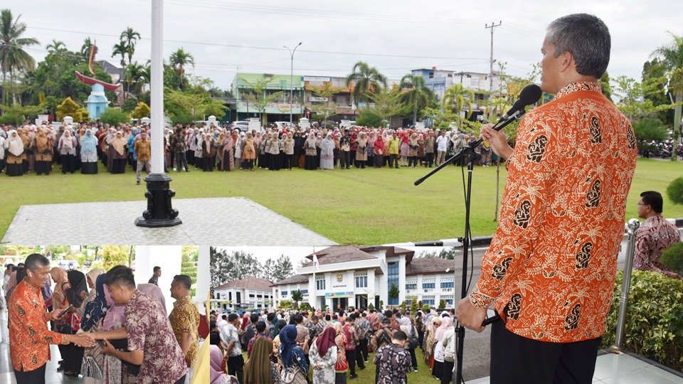 Kota Pariaman – PJ Walikota Roberia pimpin apel gabungan ASN Kota Pariaman di halaman Balaikota, Kamis (7/3/2024). Kegiatan apel gabungan ini, dalam rangka memasuki bulan suci Ramadan 1445 H/2024 M.