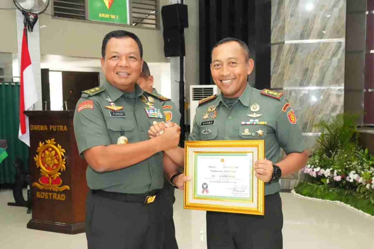 Jakarta, fajarharapan.id – Letkol Arm Siswo Budiarto, S.I.P., M.M., M.I.Pol. selaku Danmenarmed 2 Kostrad terima piagam penghargaan sebagai peringkat 2 akumulasi nilai IKPA tingkat satker di lingkungan TNI AD TA. 2023 oleh Kaskostrad Mayjen TNI Farid Makruf, M.A. dalam kegiatan Rapat Pimpinan Kostrad TA 2024 yang dilaksanakan di Markas Divisi Infanteri 1 Kostrad, Cilodong, Depok. Kamis (7/3/2024).