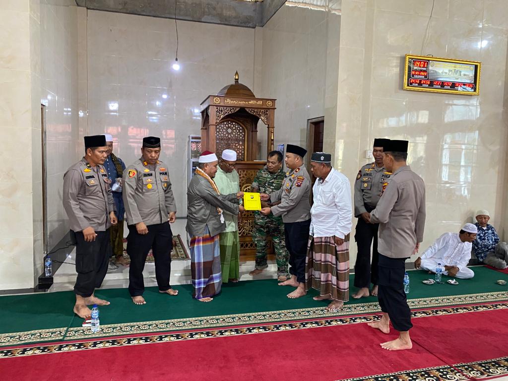 Selesai kegiatan, Wakapolres bersama rombongan memberikan bantuan yang diterima langsung oleh pengurus Masjid Taqwa Lubuk Juangan. (By Roni)
