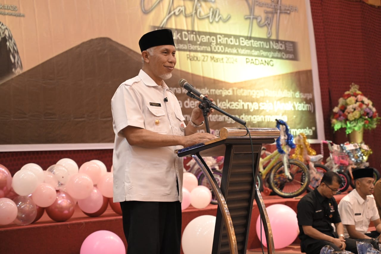 Apresiasi itu disampaikan Gubernur saat menghadiri gelaran Yatim Fest sekaligus berbuka bersama 1.000 anak yatim dan penghafal Al-Qur’an di UPI Exhibition Hall Padang, Rabu (27/3/2024). Menurut Gubernur, kepedulian tersebut merupakan wujud dilaksanakannya tanggung jawab dalam memelihara anak yatim.