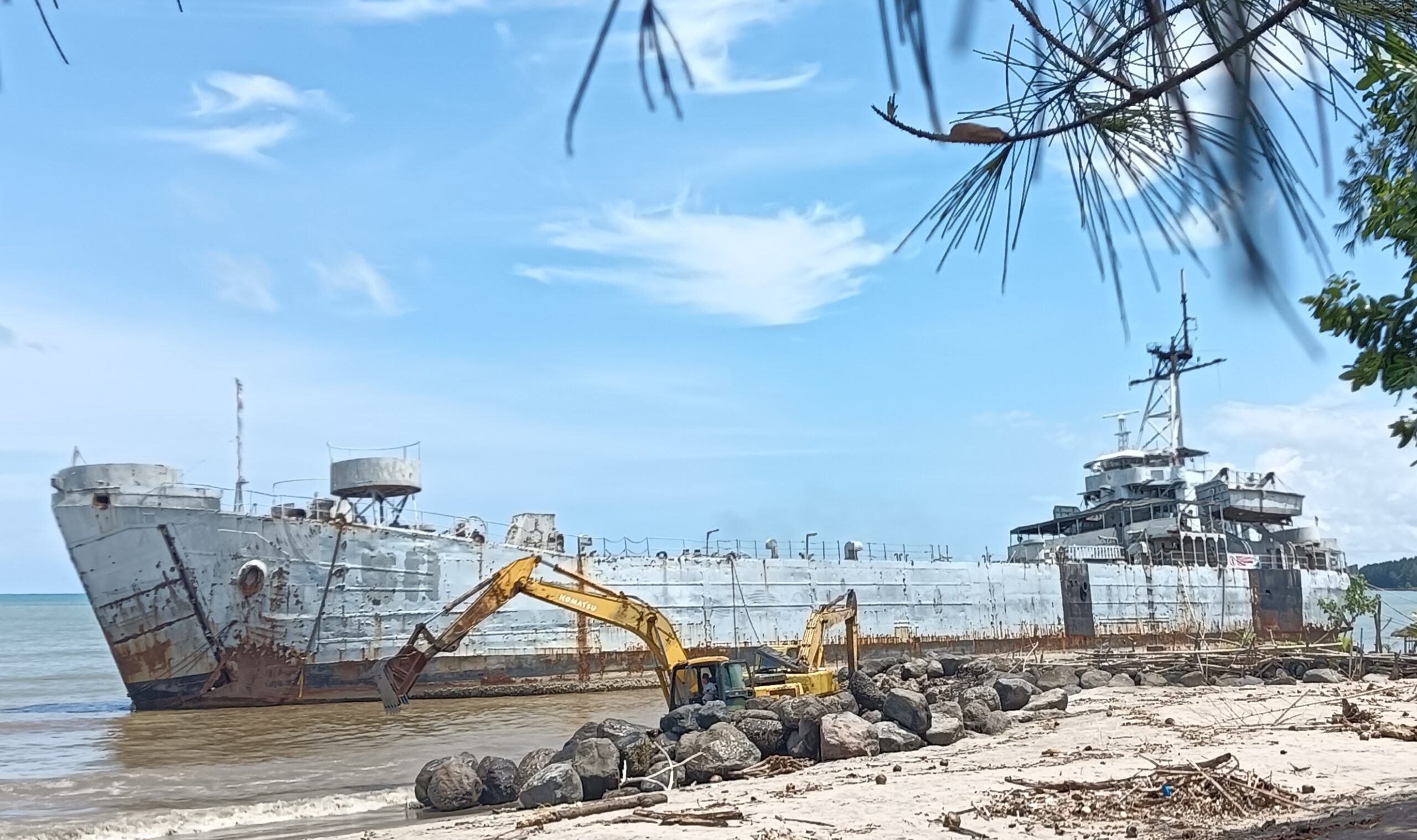Kota Pariaman – Agaknya, untuk penyelamatan bekas Kapal Perang Republik Indonesia (KRI) Teluk Bone 511 yang tersandar di tepi pantai kawasan Talao Pauh Water Front City, Pauh, Kota Pariaman, telah bekerja 2 (dua) buah alat berat escavator, Jum’at (5/4/2024).