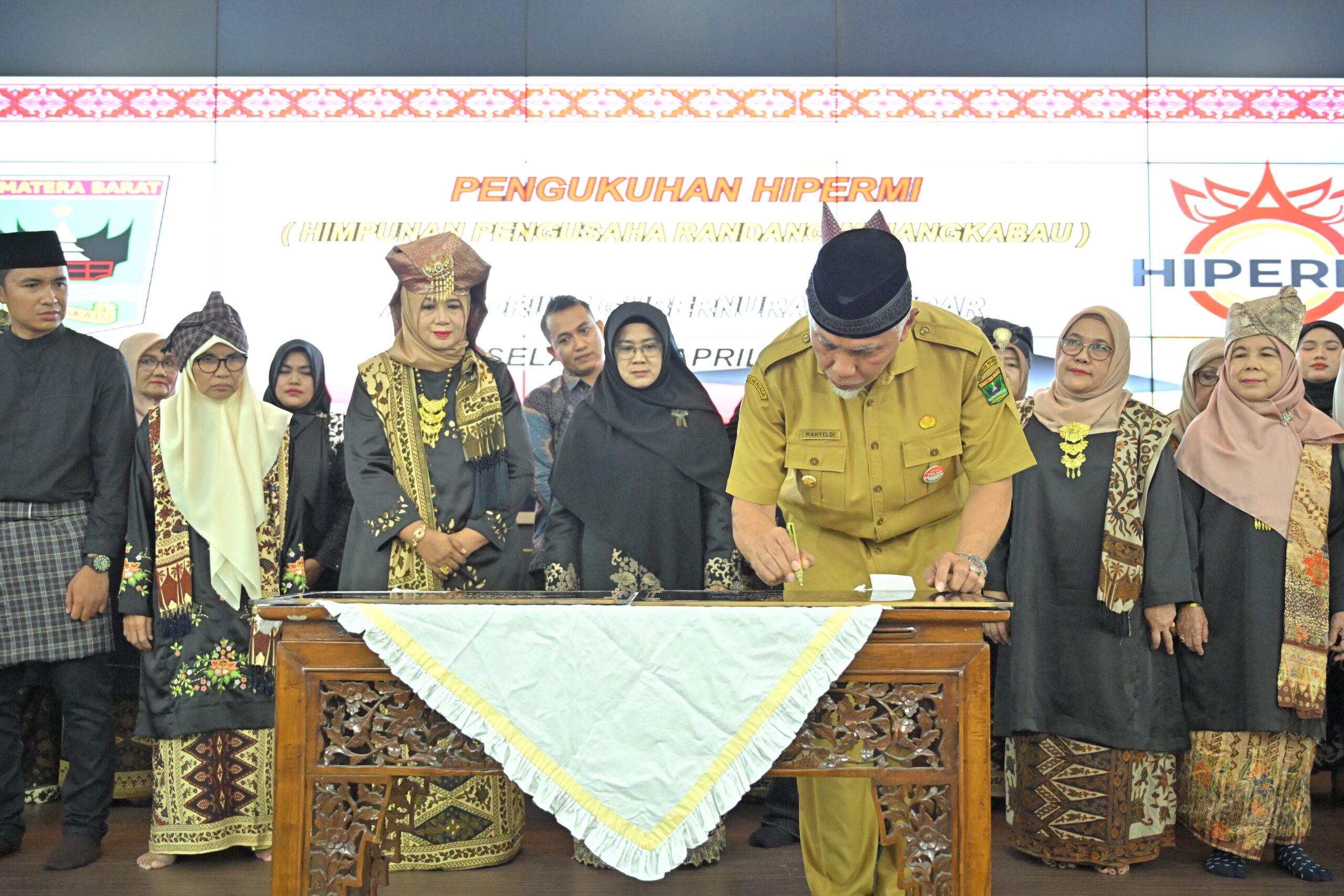 PADANG — Gubernur Sumatera Barat (Sumbar) Mahyeldi Ansharullah mengukuhkan Pengurus Himpunan Pengusaha Rendang Minangkabau (Hipermi) periode 2024-2027 tingkat provinsi dan kabupaten/kota, serta pengurus Koperasi Hipermi di Auditorium Istana Gubernuran, Selasa (23/4/2024). Gubernur meyakini, kehadiran Hipermi akan membuat usaha atau industri pengolahan randang di Sumbar akan berdaya saing tinggi.