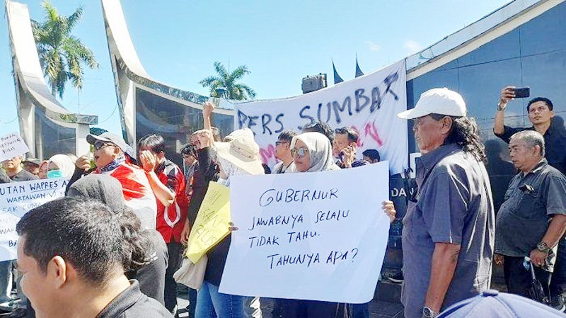 Puluhan wartawan Sumbar yang tergabung dari berbagai organisasi jurnalis tersebut melakukan aksi damai di depan kantor gubernur dan menuntut oknum mengusir wartawan dituntut agar diproses. Sebab telah mengalang-halangi tugas wartawan yang dilindungi undang-undang.