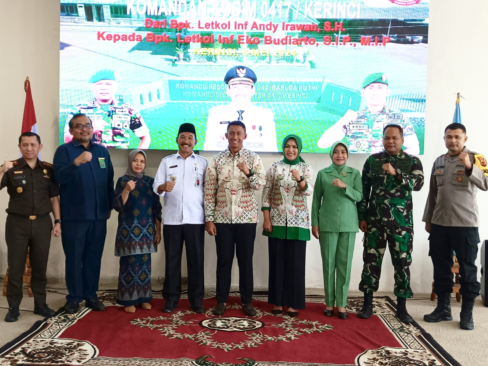Kegiatan Lepas Sambut tersebut dipusatkan di Ruang Pola Kantor Bupati Kerinci Bukit Tengah dan diwarnai suasa haru bahagia atas dedikasi Letkol Inf. Andi Irawan selama menjabat Dandim 0417/Kerinci.