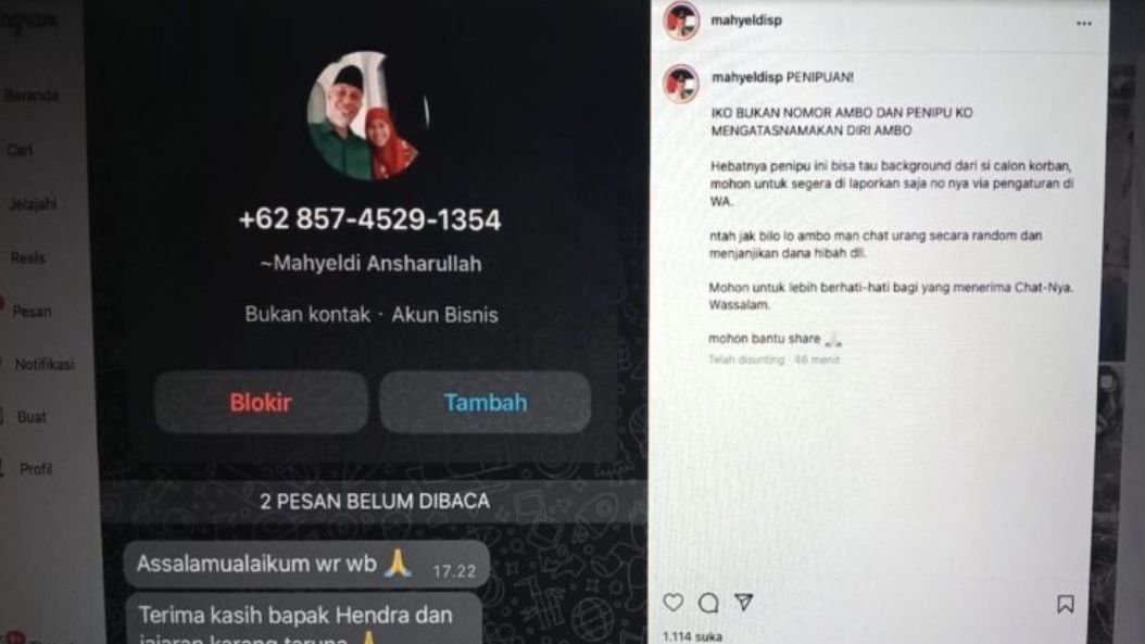 Mursalim menyebut, postingan dari akun instagram pribadi Gubernur tersebut langsung mendapatkan respon dari warganet. Bahkan, ada yang berkomentar sudah menerima pesan dari nomor penipu tersebut yang mengatasnamakan ‘Mahyeldi’. (Adpsb/Bud)