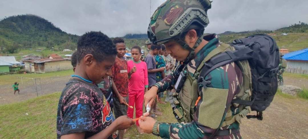 Puncak, fajarharapan.id – Wujud perhatian dan kepedulian terhadap kesehatan anak-anak Papua, Satgas Mobile Yonif 323/BP Pos Sinak memberikan edukasi menjaga kesehatan gigi yang baik dan benar melalui sosialisasi cara menyikat gigi kepada anak-anak Kp Gigobak, Distrik Sinak, Kab.Puncak, Papua, Kamis (06/05/2024).