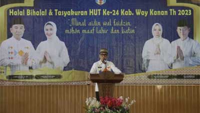 Way Kanan – Pemerintah Kabupaten Way Kanan menggelar Acara Hala Bihalal Hari Raya Idul Fitri 1444 H serta Tasyakuran Hari Ulang Tahun Ke-24 Kabupaten Way Kanan Tahun 2023 di Gedung Pusiban Kabupaten Way Kanan, Rabu (03/05/2023).