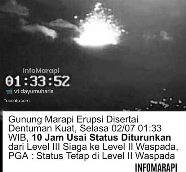 Ini merupakan letusan pertama setelah status gunung setinggi 2891 mdpl tersebut diturunkan ke Level II atau Waspada pada Senin, 1 Juli pukul 15.00 WIB.