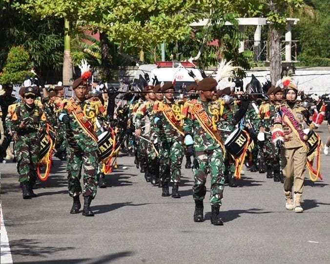 Kota Pariaman – Penampilan Marching Band peserta Latihan Integrasi Taruna Wreda Nusantara (Latsitardanus) XLIII di Kota Pariaman, membuat warga Kota terpana lihat unjuk kebolehan ketika perjalanan Kirab di sepanjang jalan, sejak star Balaikota menuju lokasi finish di Muaro Pantai Gandoriah, Kota Pariaman, Sabtu (20/5/23).