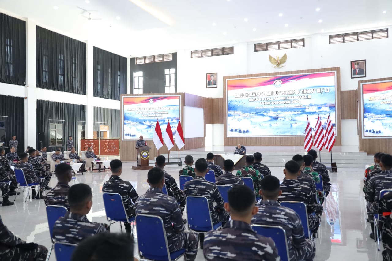 Sorong, fajarharapan.id – Sesuai dengan dasar petunjuk latihan TNI AL tahun 2014 dan surat perintah Pangkoarmada III tahun 2024, Satuan kapal Amfibi (Satfib) Koarmada III menggelar latihan Geladi Tugas Tempur (Gelagaspur) Tingkat III atau L3 tahun anggaran 2024 yang diawali dengan Briefing Awal latihan oleh Inspektur Koarmada III Laksamana Pertama TNI Azil Sadagori Achmad mewakili Panglima Komando Armada (Pangkoarmada) III Laksamana Muda TNI Hersan, S.H., M.Si. di gedung serba guna (GSG) Maspardi Koarmada III Jl. Yos Sudarso Katapop,Salawati, Kabupaten Sorong Provinsi Papua Barat Daya. Rabu, (28/08/24)
