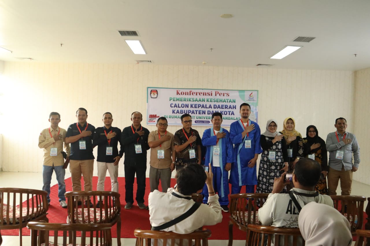 Untuk informasi, jadwal pemeriksaan kesehatan bakal calon yang dipusatkan di Rumah Sakit Universitas Andalas Padang, dijadwalkan bahwa pada tanggal 31 Agustus 2024 adalah pemeriksaan kesehatan bakal calon yang mendaftar pada hari pertama (27/08) yaitu Sabar AS-Sukardi. Untuk tanggal 1 September 2024 adalah Bapaslon yang mendaftar di hari kedua (28/08), yaitu Welly Suheri-Anggit Kurniawan dan untuk tanggal 2 September 2024 adalah pemeriksaan kesehatan bapaslon yang mendaftar di hari ketiga (29/08) yakni, Mara Ondak dan Desrizal.