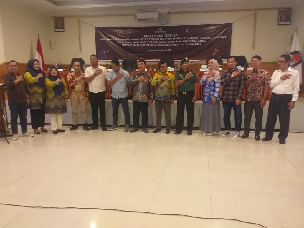 Solsel,fajarjarapan.id’– Komisi Pemilihan Umum (KPU) Kabupaten Solok Selatan menggelar Rapat Pleno Terbuka Rekapitulasi dan Penetapan Daftar Pemilih Tetap (DPT) tingkat Kabupaten Solok Selatanl untuk Pemilihan Kepala Daerah (Pilkada) 2024,Rabu (19/9/2024).