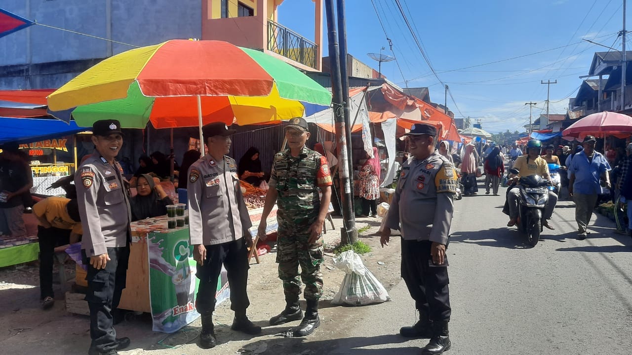 “Untuk hari ini, personel TNI-Polri bersinergi dalam memonitoring dan memantau kegiatan masyarakat yang sedang berlangsung di pasar tradisional serta memberikan imbauan kamtibmas,” ucap Kapolsek,