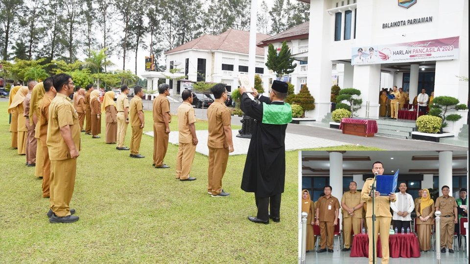 Kota Pariaman – Walikota Genius Umar melantik 23 Pejabat terdiri dari 2 pejabat Eselon III, 1 pejabat Eselon IV dan 1 Kepala Sekolah Dasar di Lingkungan Pemerintah Kota Pariaman di halaman Balaikota, Senin sore (5/6/23).