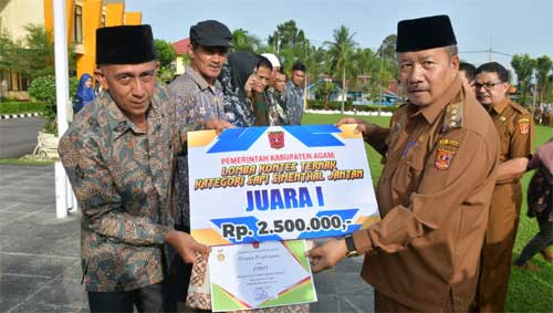 Lubuk Basung – Bupati Agam, Dr H Andri Warman menyerahkan hadiah pada peternak pemenang kontes ternak, di halaman Kantor Bupati Agam, Senin (5/6).