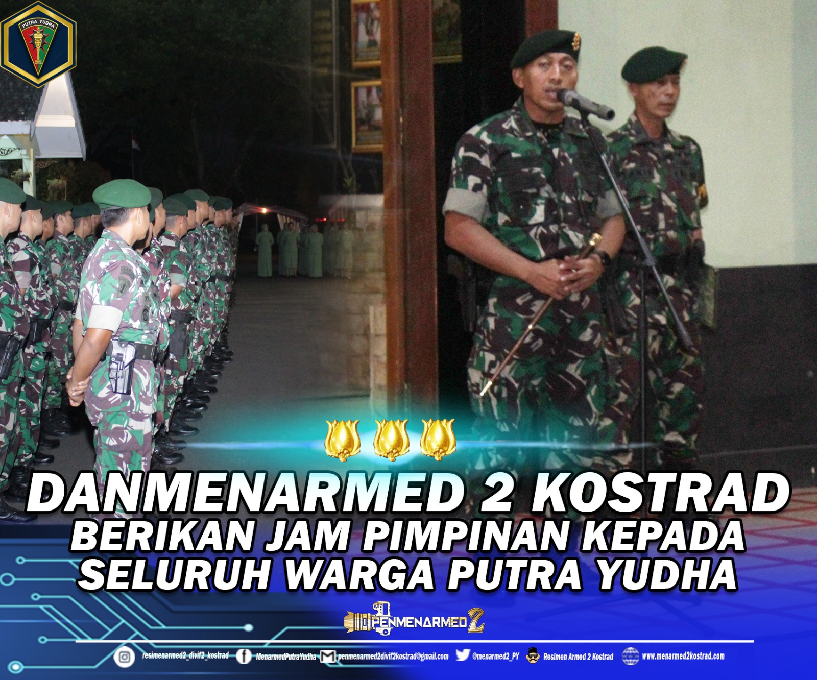 Malang, fajarharapan.id – Pada hari Sabtu (03/05/2025), di Markas Menarmed 2 Kostrad, Kolonel Arm Siswo Budiarto, S.I.P., M.M., M.I.Pol., selaku Komandan Resimen Armed 2/PY/2 Kostrad, memberikan jam pimpinan kepada seluruh warga Putra Yudha. Kegiatan ini dilaksanakan di tengah kesibukan serta tanggung jawab baru beliau sebagai Dandenma Kodam Jaya.