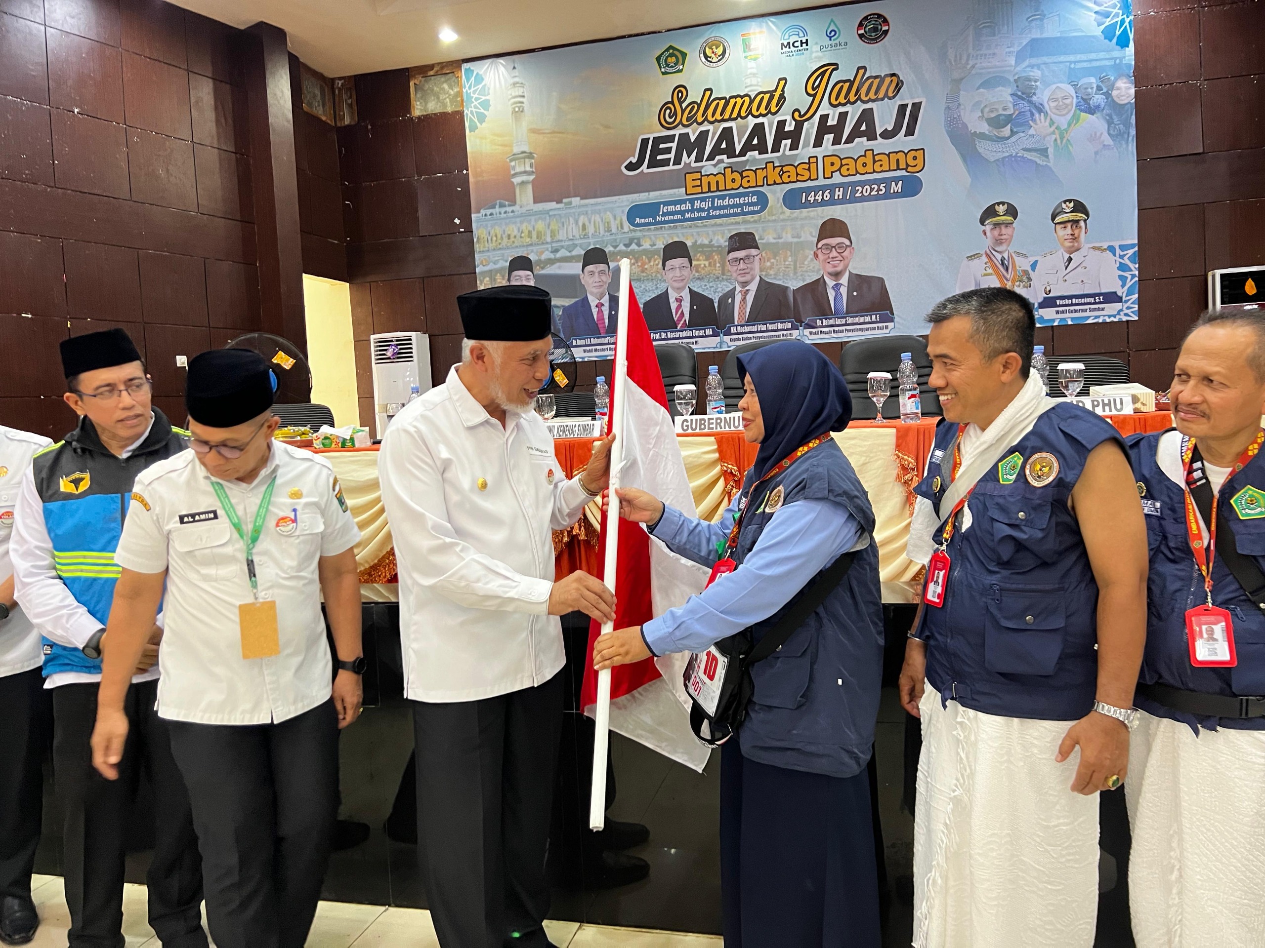 Padang — Gubernur Sumatera Barat (Sumbar) Mahyeldi Ansharullah melepas keberangkatan 420 calon jemaah haji yang tergabung dalam Kloter 14 Embarkasi Padang di Asrama Haji Tabing. Rabu (28/5/2025).